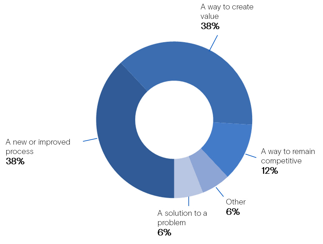38% of the respondents define innovation as a new or improved process. An equally large proportion defines innovation as a way of creating value.