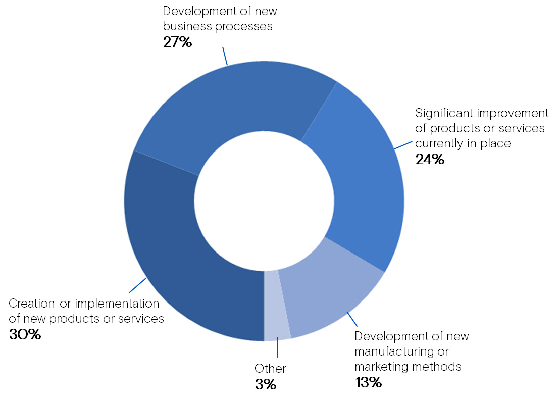 Invention or implementation of new products or services accounts for 30% of the innovative initiatives carried out over the last three years. Closely followed by the development of new business processes and the significant improvement of existing products or services.