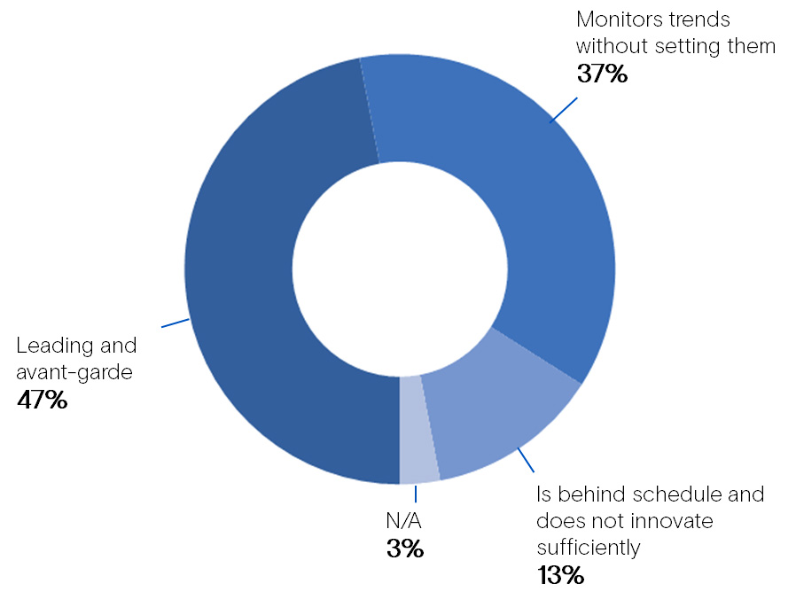 As for market positioning, 47% of respondents consider themselves as innovation leaders, while 37% consider themselves as trend followers, but without being ahead of them.