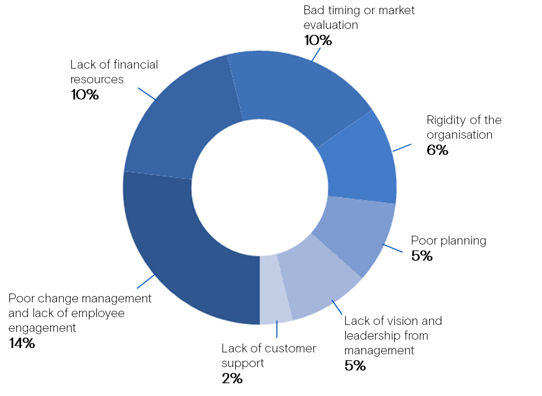 Change management and employee engagement are also identified by respondent as key challenges to successful innovation. Lack of financial resources and bad timing would also be among the potential factors of failure to consider.