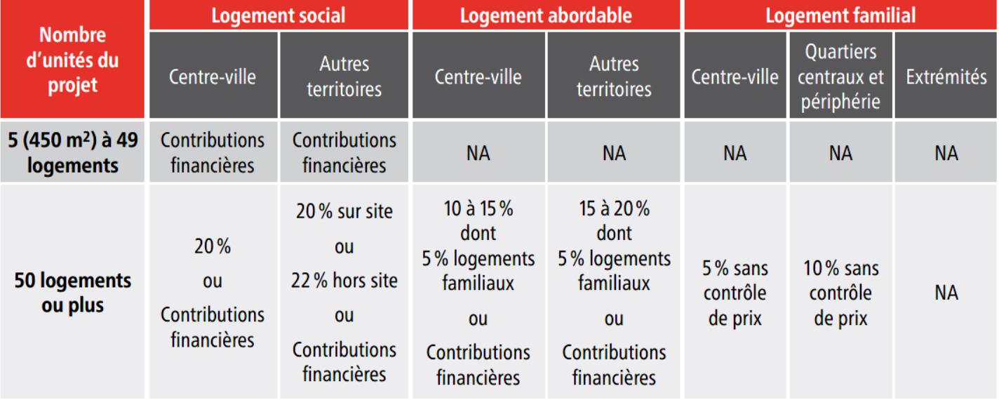 Il est à noter que la Ville de Montréal a adopté un projet de Règlement visant à améliorer l’offre en matière de logement social, abordable et familial[2] le 12 juin dernier. Son adoption finale est prévue pour le début 2020 et son entrée en vigueur le 1er janvier 2021. Des consultations sont actuellement en cours.[3] Nous n’aborderons pas ici en détail le contenu de ce règlement, puisque celui-ci est appelé à changer suivant les consultations. Le tableau suivant, préparé par la Ville de Montréal, résume les contributions qui sont actuellement envisagées à ce règlement: